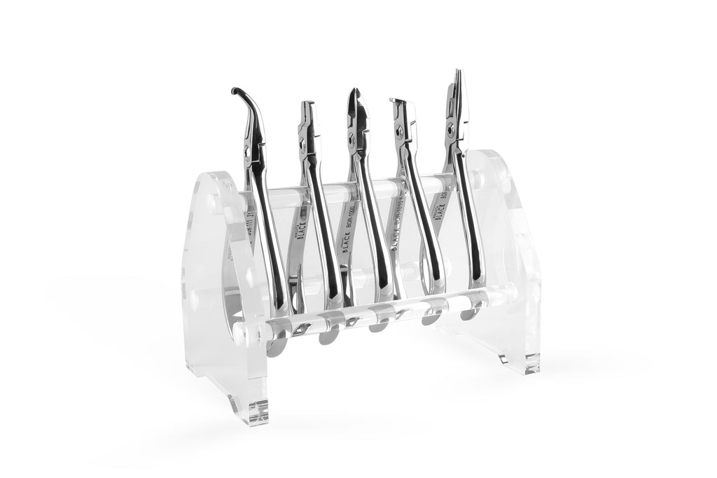 Construcción de acrílico translúcido de 1 cm de espesor, puede albergar hasta 6 instrumentos. Pinzas se venden por separado.