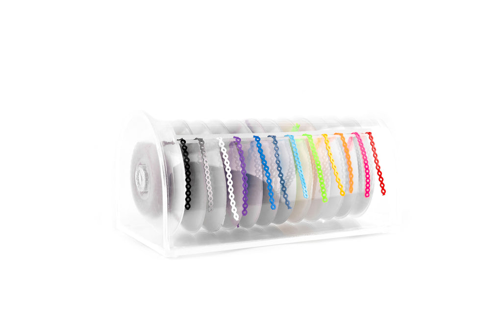 Cuerpo de acrílico altamente resistente, con diseño para dispensar y almacenar cadenas elásticas. Las cadenas se venden por separado.